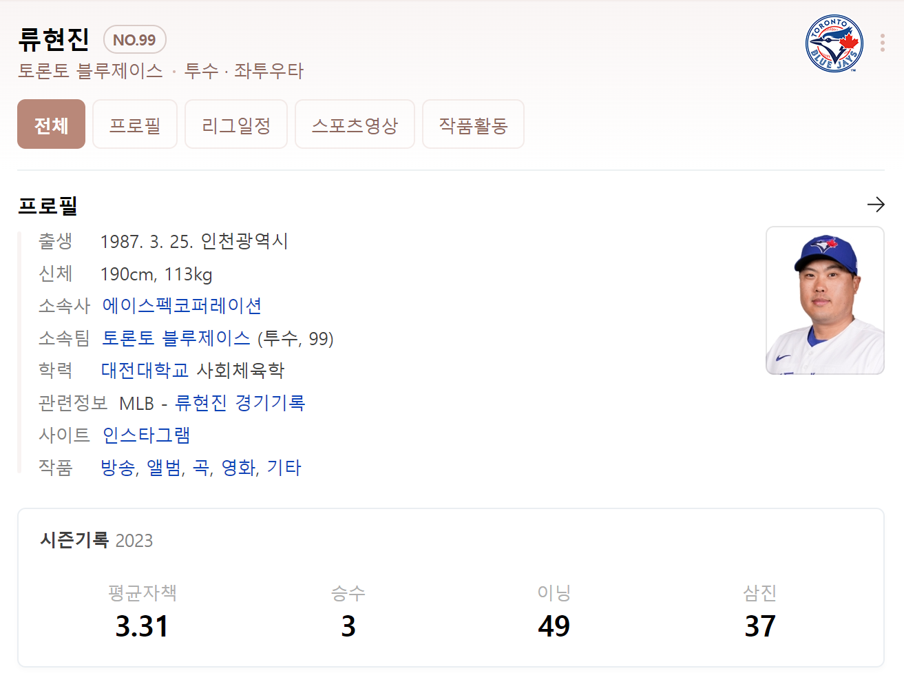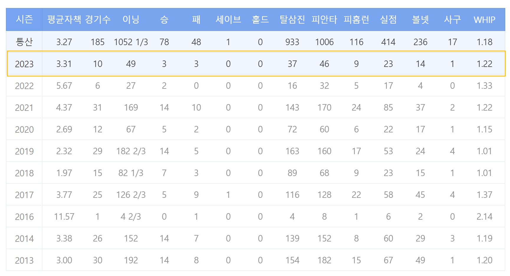 3. 2023년 류현진 성적