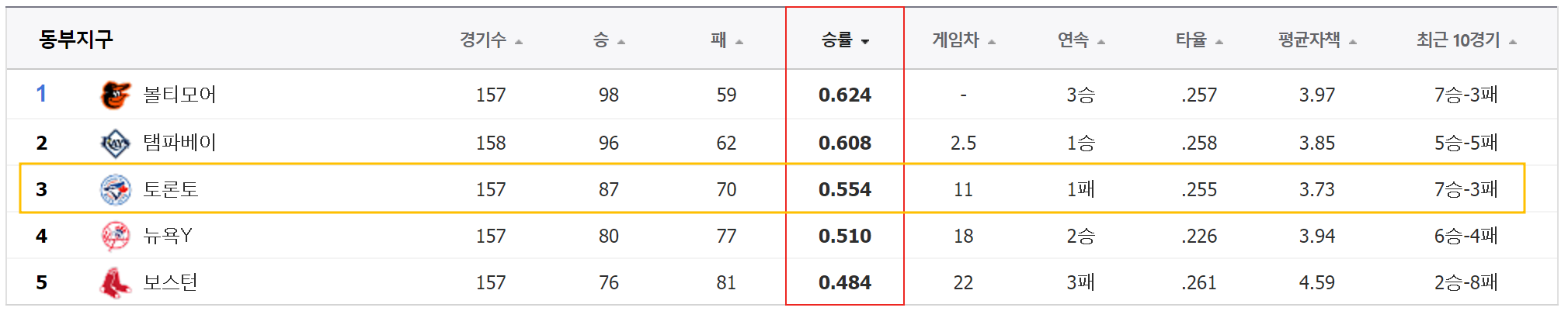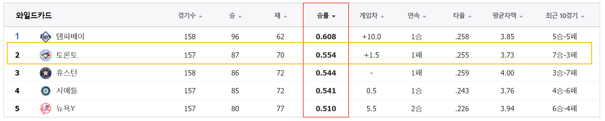 토론토는 와일드카드 2위에 위치해있습니다.