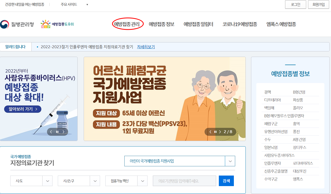 홈페이지 접속 후 아래의 그림처럼 좌측 상단의 예방접종 관리를 클릭하면 페이지가 활성화 됩니다.