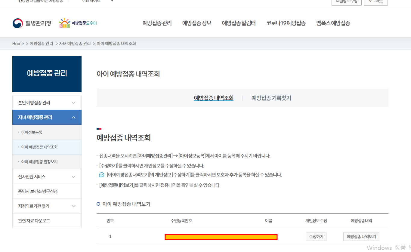 자녀 예방접종 내역 확인 방법