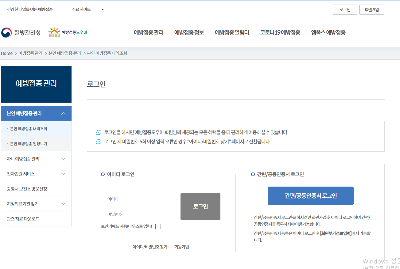 본인 예방접종 관리를 클릭하면 로그인 창이 뜹니다.