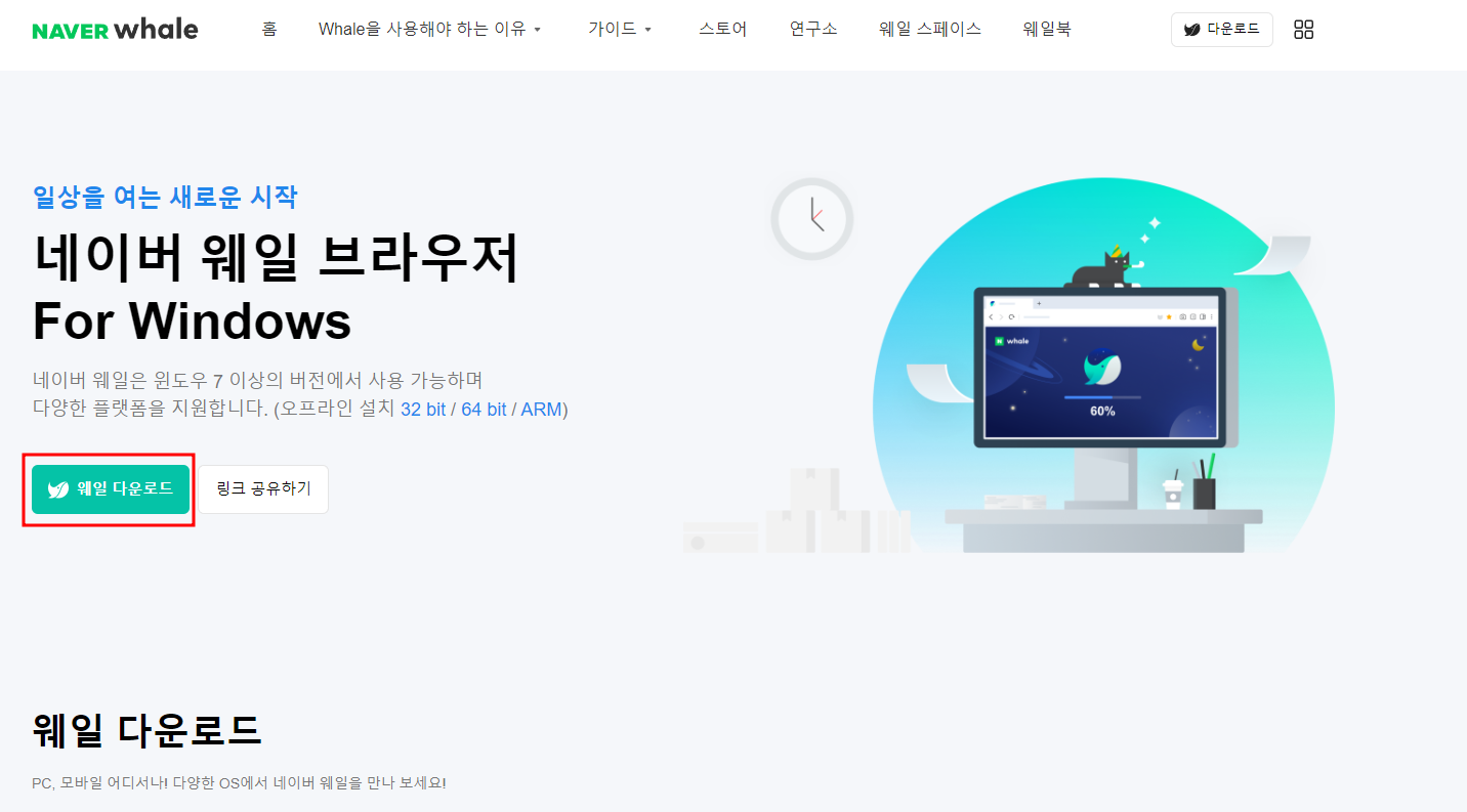 위의 링크를 클릭하면 웨일 브라우저를 다운로드 받을 수 있습니다.