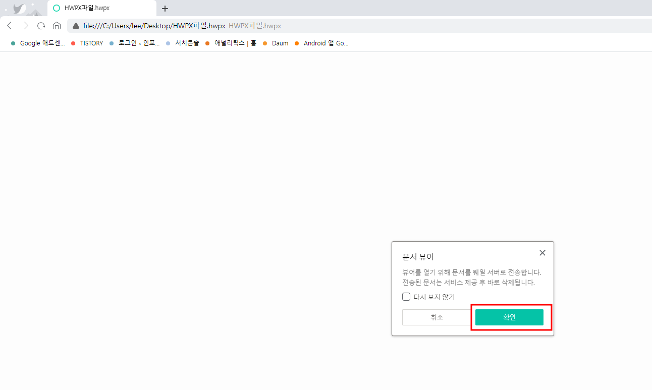 아래처럼 창이 뜨며 확인을 클릭하면 hwpx 파일 여는방법을 쉽게 완료할 수 있습니다.