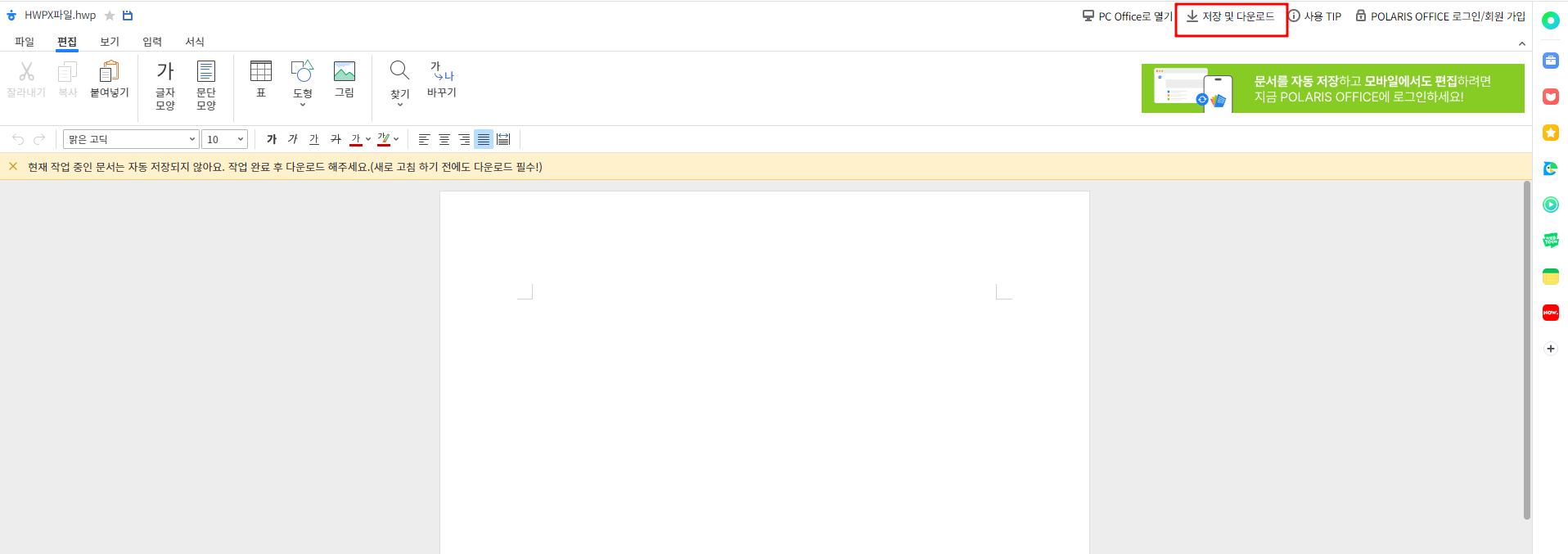 이제 hwpx파일이 hwp파일로 열려있습니다. hwp파일을 저장하기 위해 아래 그림처럼 저장 및 다운로드를 클릭하면 쉽게 내 PC로 hwpx파일을 hwp파일로 저장할 수 있습니다.