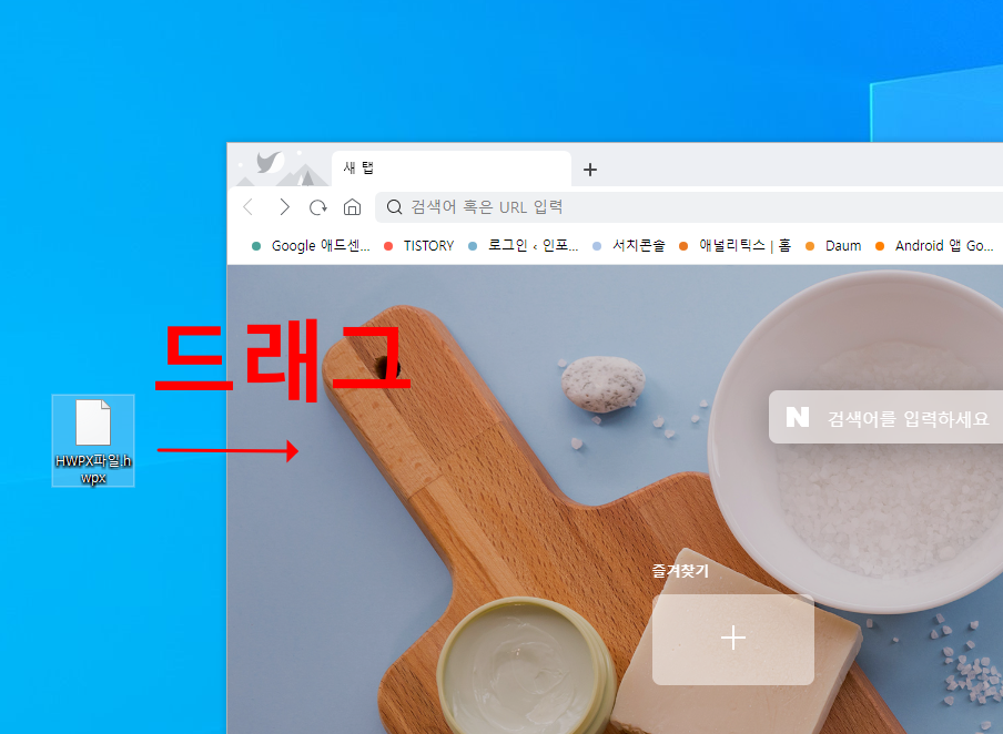 hwpx 파일 여는 방법은 웨일 브라우저에 아래의 그림처럼 hwpx 파일 을 웨일 브라우저 안으로 드래그합니다.