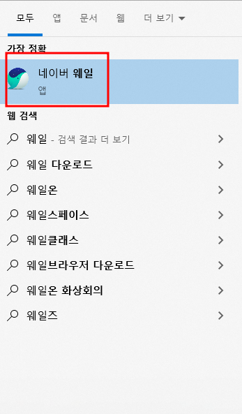 바탕화면 좌측 하단의 윈도우 아이콘을 클릭하고 키보드에서 웨일을 입력하면 아래의 그림과 같이 아이콘을 확인할 수 있습니다. 클릭하여 실행합니다.