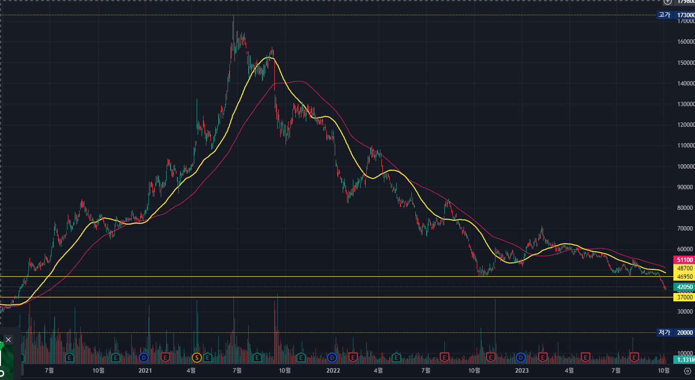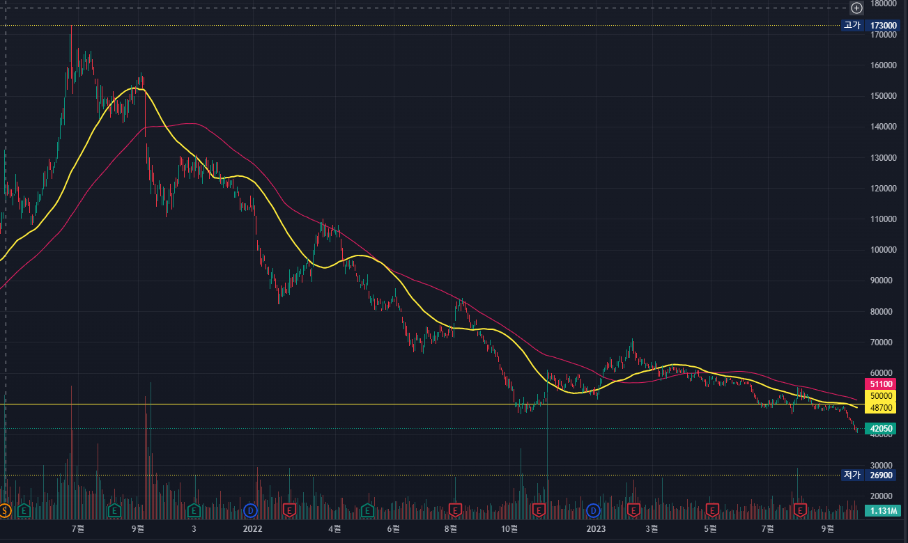 고점은 173,000원이며 현재가격은 42,050원 입니다.
