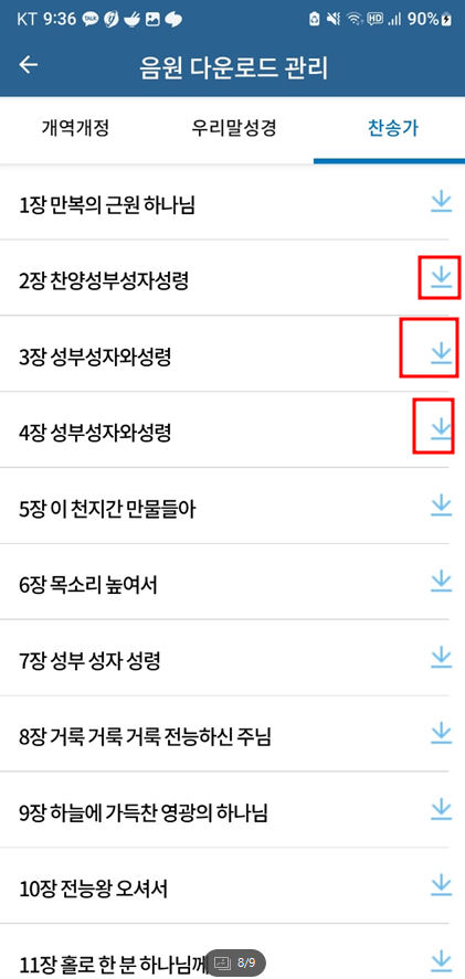 원하는 찬송가의 우측의 다운로드 받기 버튼을 클릭하면 찬송가가 다운로드되어 인터넷이 되지 않는 환경에서도 찬송가 어플로 재생이 가능합니다.