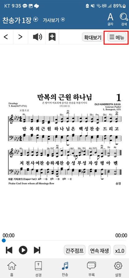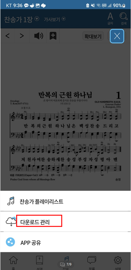 다음은 무료로 다운로드 받아서 인터넷이 되지 않는 환경에서도 재생이 가능하게 설정하는 방법에 대해 알아보겠습니다. 찬송가 화면에서 우측 상단의 메뉴 버튼을 클릭합니다.