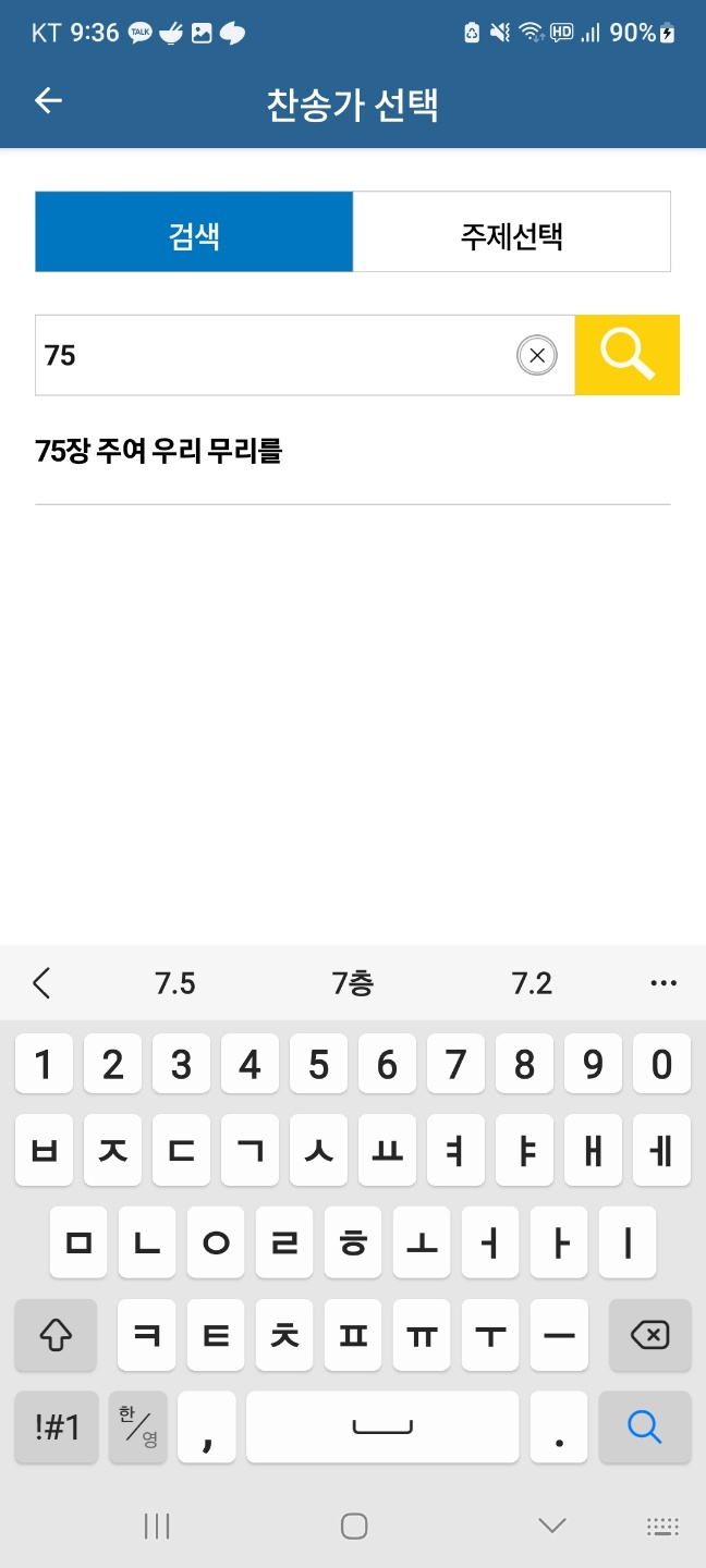위의 화면에서 우측 상단의 검색 버튼을 클릭합니다. 아래와 같이 원하는 찬송가를 검색하여 듣기가 가능합니다.