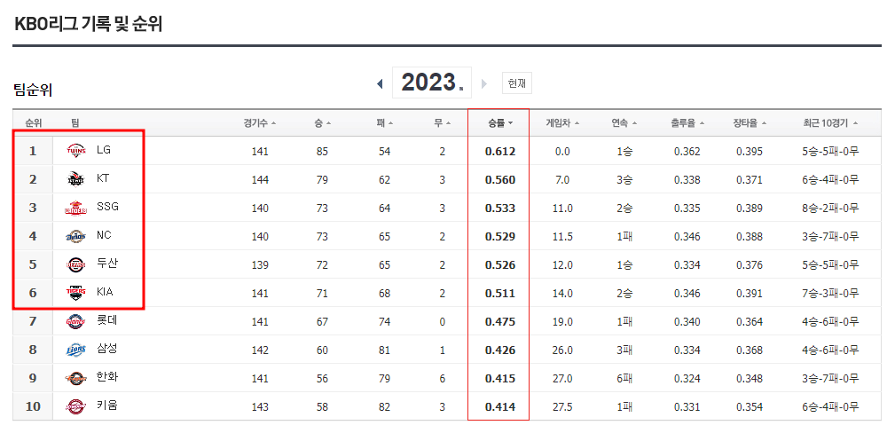 1. 2023년 프로야구 순위(10월 13일 기준)