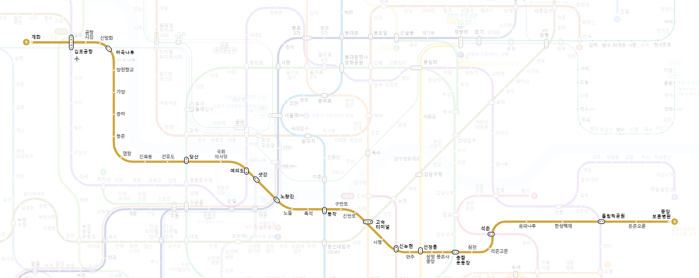 9호선 급행 노선과 비교하기 위해 9호선 전체 노선도를 알려드립니다.