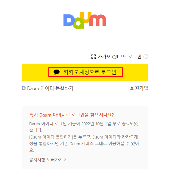 먼저 카카오계정으로 로그인을 해보시고 과거 사용하던 메일이 없다면 아래의 화면에서 Daum 아이디 통합하기를 클릭하여 통합을 진행하고 로그인을 하시면 됩니다.