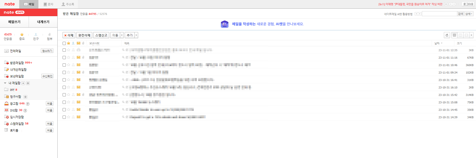 네이트 메일에 접속하면 아래의 화면 처럼 메일 리스트를 확인할 수 있습니다.