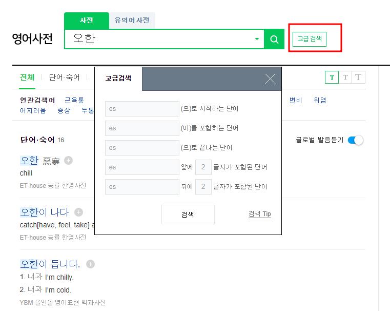 마지막으로 잘 모르는 단어를 검색할 경우 아래의 그림과 같이 고급 검색 버튼을 클릭하면 하단에 작은 박스가 활성화 됩니다.
