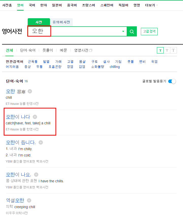 오한이 나다의 오한을 검색했습니다. 아래와 같이 catch a chill 이라는 표현을 바로 확인할 수 있습니다.