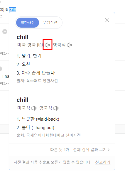 해당 박스에서 아래의 그림과 같이 스피커 모양을 클릭하면 미국식 발음과 영국식 발음을 구분하여 들을 수 있습니다.