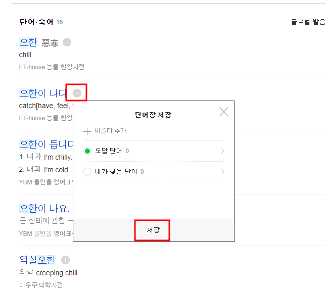 +버튼을 클릭하면 단어장 저장이라는 박스가 활성화되며 하단의 저장을 클릭하면 나의 단어장에 저장하여 필요할 때 다시 확인할 수 있습니다.