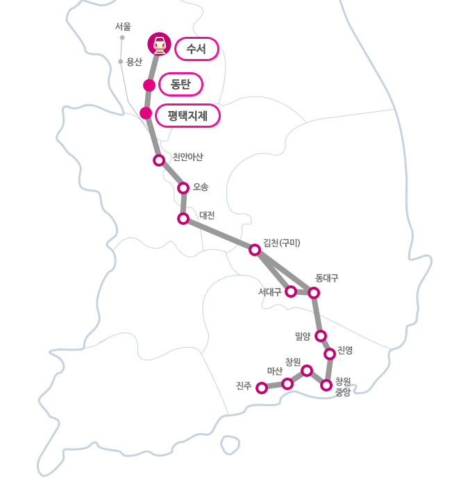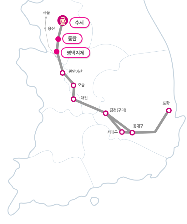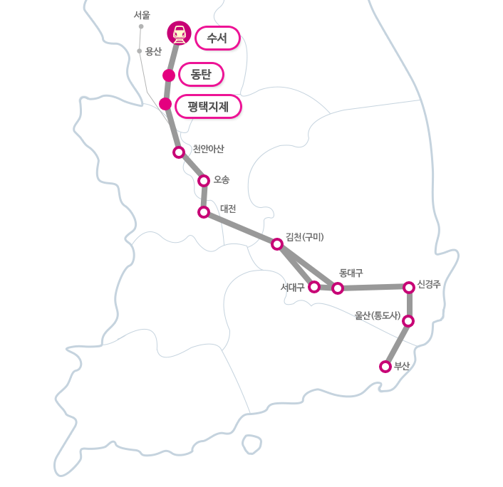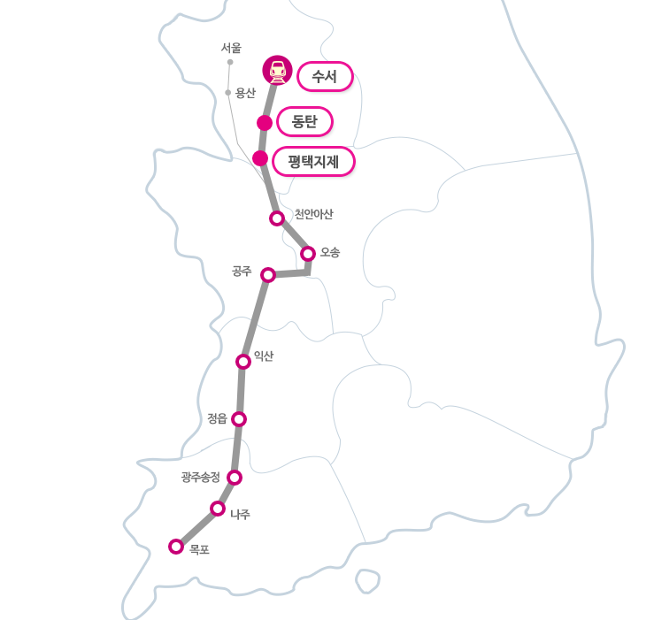 수서, 동탄, 평택지제역처럼 색이 칠해진 부분은 SRT 전용역입니다.