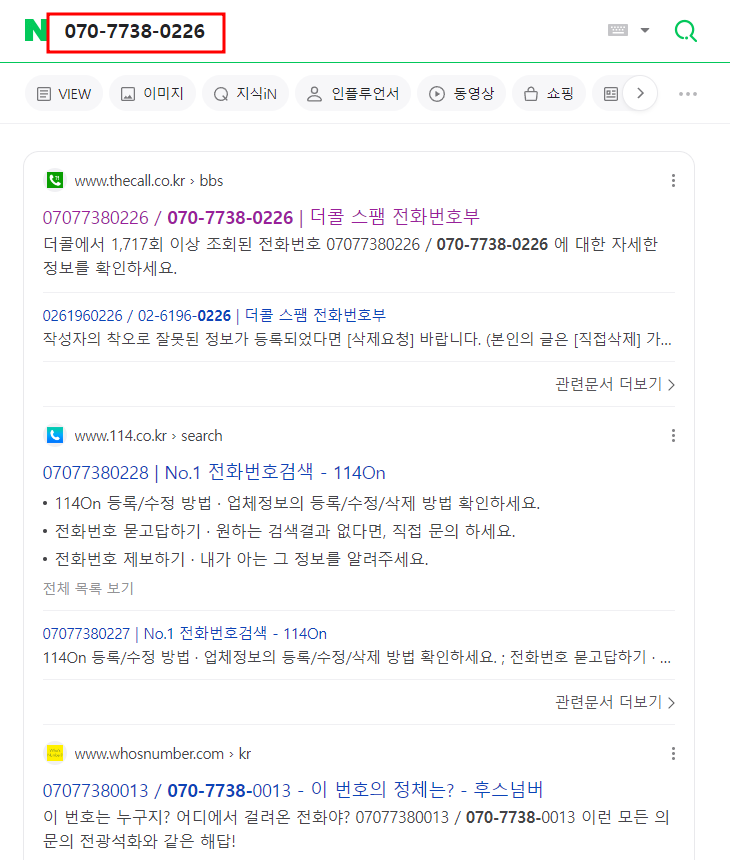 즉 네이버에서 전화번호로 바로 검색하면 스팸번호인지 쉽게 확인이 가능한 것을 알 수 있습니다.