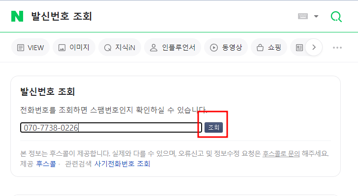 검색결과가 네이버에서 그냥 전화번호로 검색한 것과 발신번호 조회란에 입력한 것과 차이가 없는 것 같아서 전화번호만 네이버에서 바로 검색했습니다.
