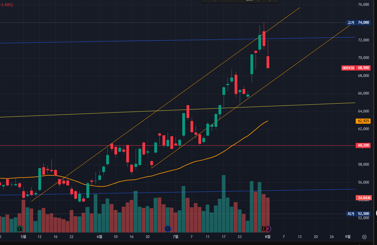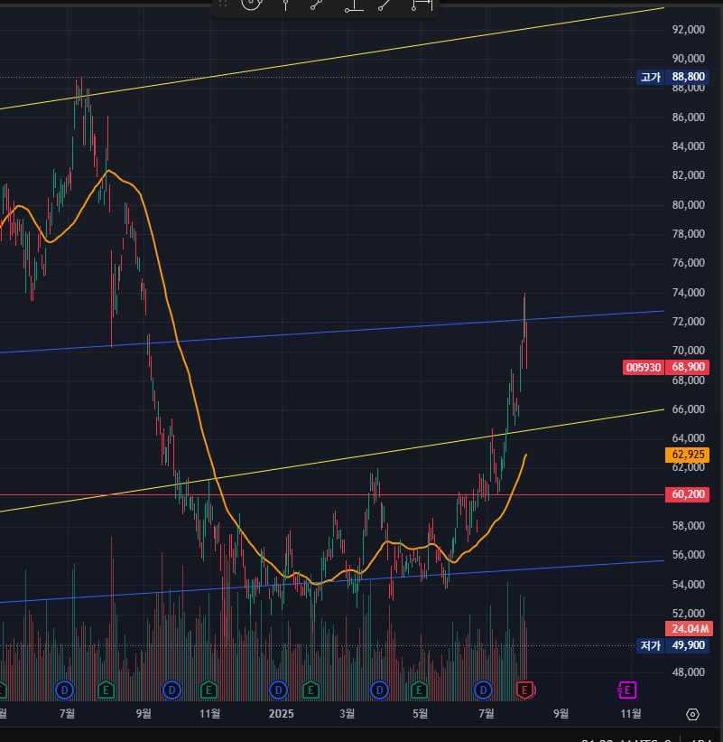 우상향 중이며 74000원 고점을 찍고 음봉이 2개 생긴 상태입니다. 5만원대 바닥을 단단하게 만들고 올라왔기 때문에 한 번에 디렉트로 6만 원을 깨고 내려가긴 정말 쉽지 않아 보이는 차트입니다.
