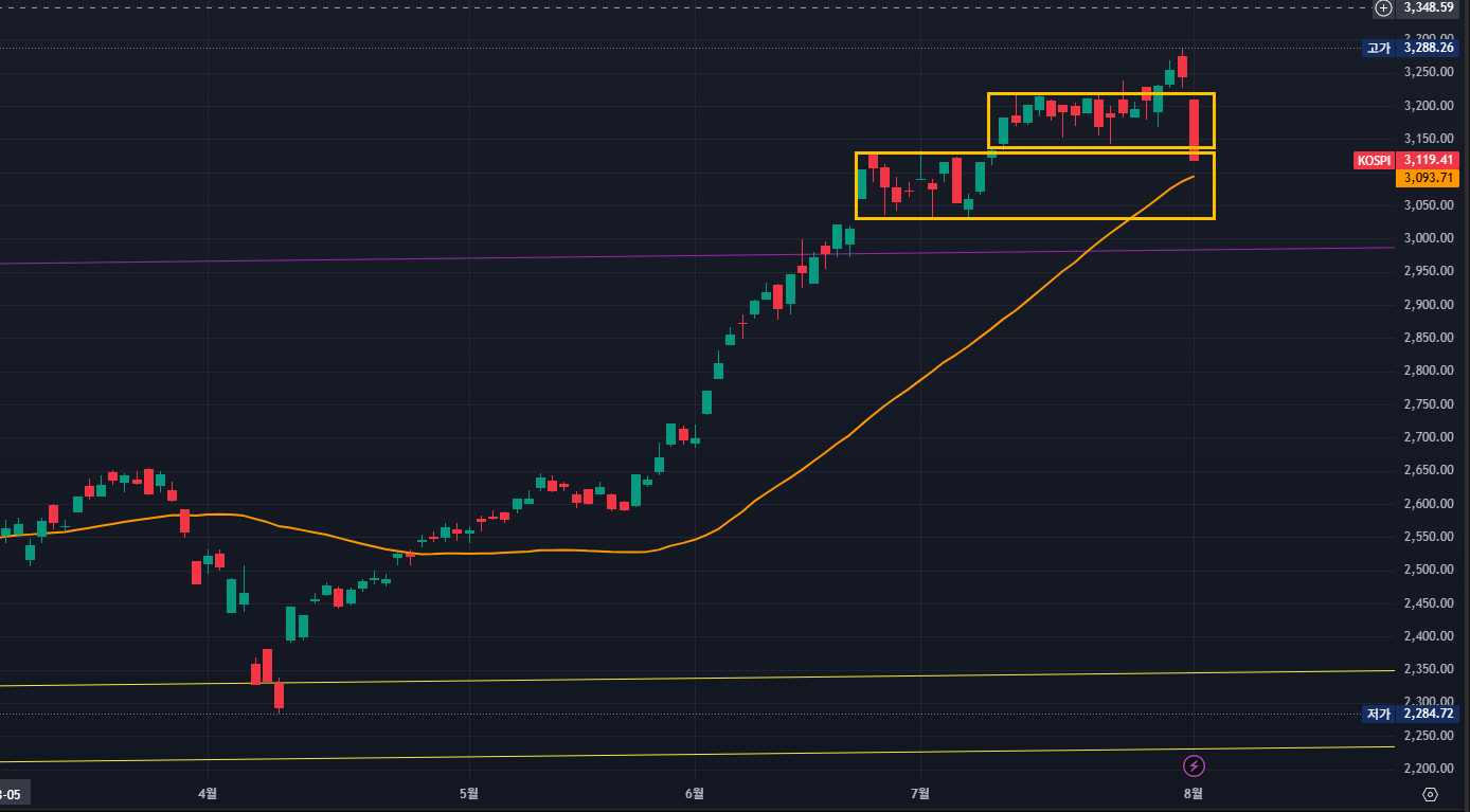 오늘은 코스피 지수가 폭락을 했습니다. 코스피 지수가 약 4% 하락했고 삼성전자가 3%, SK하이닉스가 5%대 하락을, 그리고 나머지 종목들도 대부분 크게 하락하며 장이 마감되었고 종가가 저가로 아주 안 좋은 시그널로 마감했습니다. 함께 알아보겠습니다.